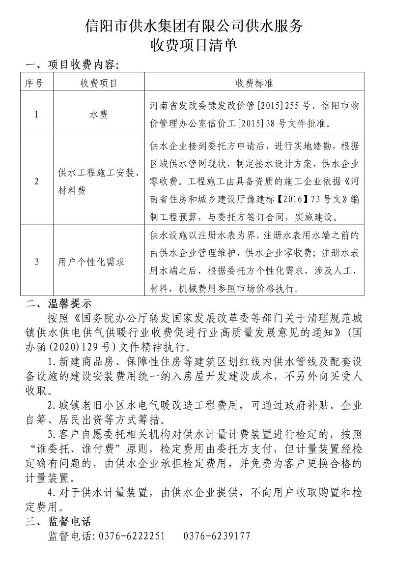 經(jīng)河南省發(fā)改委豫發(fā)改價(jià)管〔2015〕255號(hào)文件、信陽(yáng)市物價(jià)管理辦公室信價(jià)工〔2015〕38號(hào)文件批準(zhǔn),從2015年4月1日起對(duì)市中心城區(qū)供水價(jià)格進(jìn)行調(diào)整。河南省人民政府豫政〔2017〕44號(hào)文件對(duì)河南省水資源稅進(jìn)行了調(diào)整,信陽(yáng)市物價(jià)管理辦公室、信陽(yáng)市財(cái)政局、信陽(yáng)市城市管理局價(jià)調(diào)〔2018〕27號(hào)文件對(duì)我市污水處理收費(fèi)標(biāo)準(zhǔn)進(jìn)行了調(diào)整,具體如下: